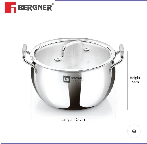 Bergner BE Essentials TriPly Stainless Steel 16cm Rice Handi with Lid, Small Rice Handi with Handle, Even Heat Distribution, Non-Toxic, Healthy, Less Oil Use – Induction and Gas Stove Ready