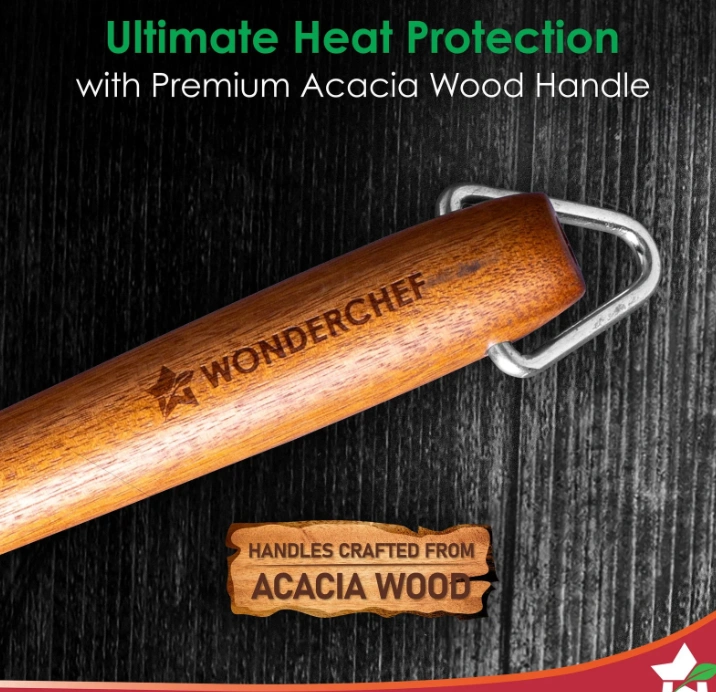 - Elegant Acacia Wooden Handles: The handles made from real Acacia wood don’t heat up while cooking and give a strong grip to the pans, making them convenient to use.