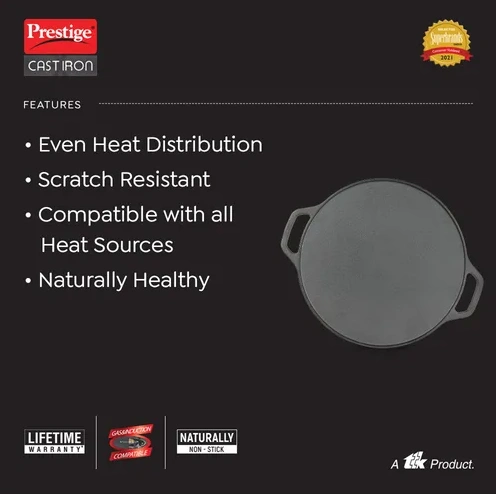 Upgrade your kitchen with the Prestige Cast Iron Dosa Tawa, designed for perfectly crisp and flavorful dosas. Crafted from high-quality cast iron, the round base ensures even heat distribution and superior heat retention, keeping food warm for longer. The cast iron dosa tawa comes pre-seasoned for a naturally non-stick experience, making cooking effortless. Versatile and durable, this cast iron tawa for dosa is compatible with gas, induction, ceramic, electric, halogen, and even firewood cooktops. A must-have for every home chef, the cast iron dosa tawa enhances the authentic taste of traditional cooking. Benefits of Cast Iron Dosa Tawa Even Cooking & Heat Retention – The iron dosa tawa heats evenly and maintains temperature for consistent results. Naturally Non-Stick & Pre-Seasoned – This tawa improves with use, requiring less oil while enhancing flavors. Versatile Use – Perfect for dosas, rotis, pancakes, and more. Durable & Long-Lasting – The dosa tawa cast iron is built for years of reliable performance. Health Benefits – Cooking on a cast iron tawa naturally boosts iron content in food. Compatible with Multiple Heat Sources – Works efficiently on gas stoves, induction cooktops, and traditional firewood cooking.