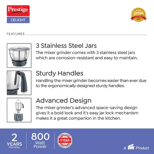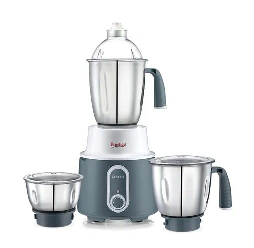 Simplify your kitchen tasks with the Prestige Delight 750W Mixer Grinder, designed for efficient and fast grinding. Equipped with three high-quality stainless steel jars (1500 ml, 1000 ml, and 300 ml), it handles wet, dry, and chutney grinding with ease.