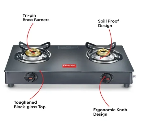 The toughened black glass top adds a touch of elegance while being easy to clean and resistant to scratches. With its spill-proof design and ergonomic knobs, cooking becomes convenient and safe for daily use. The powder-coated body offers long-lasting strength, and its ISI certification guarantees top-tier safety standards.