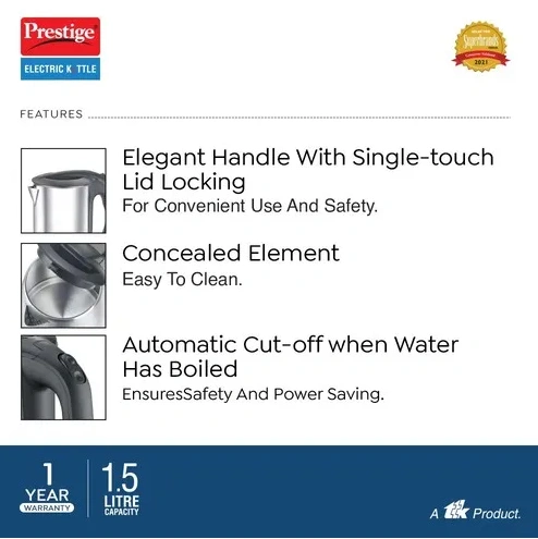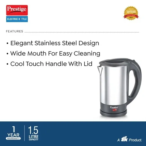 Prestige PKSS 1.5 Stainless Steel Electric Kettle 1.5 L, (Silver & Black)