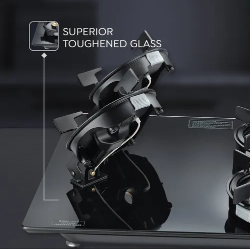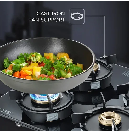 The toughened glass top is sleek, durable, and easy to clean, while the spill-proof design keeps your kitchen tidy. Ergonomic knobs provide smooth flame control, and sturdy cast iron pan supports ensure stability during cooking. Perfect for large families and everyday Indian cooking.